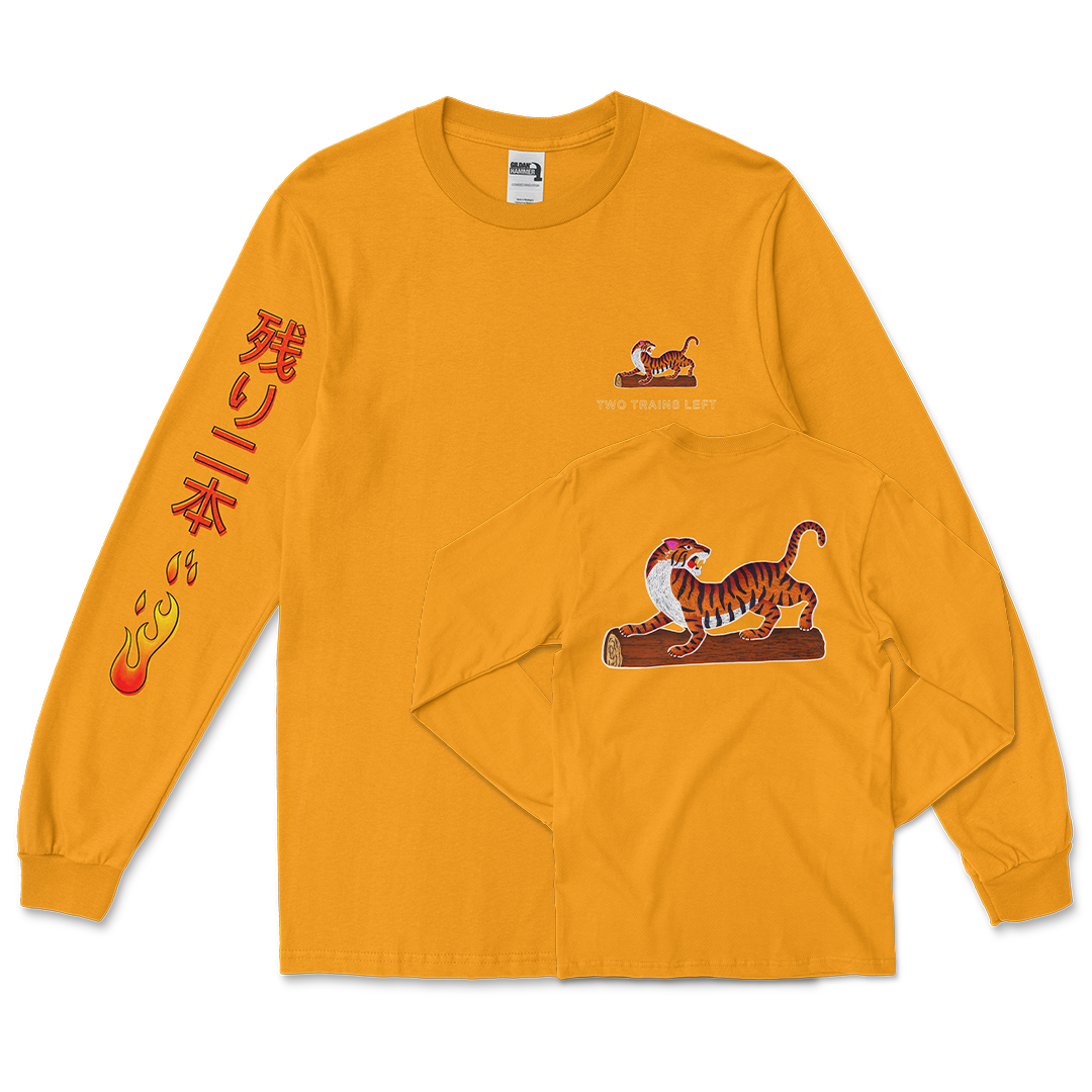 Gold long sleeve t-Shirt featuring a left chest 2TL tiger print and